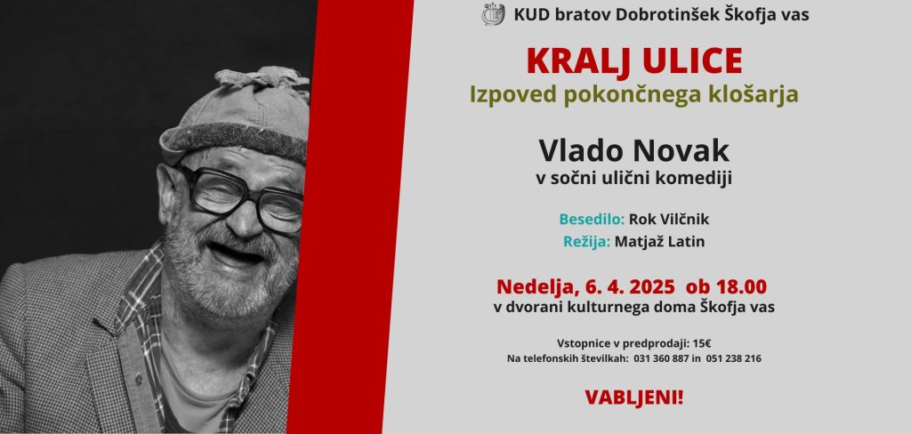 Vljudno vabljeni, da se nam v nedeljo, 6. aprila, ob 18. uri v Kulturnem domu Škofja vas pridružite na izjemni monokomediji Kralj ulice, v izvedbi mojstra slovenskega gledališča, Vlada Novaka. Ne zamudite večera smeha, mojstrske igre in nepozabne gledališke izkušnje!