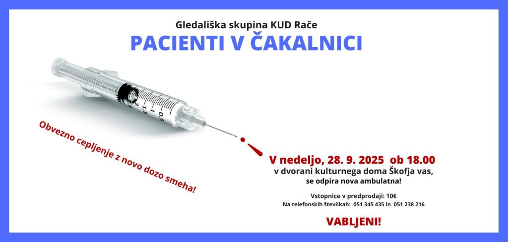 Vabljeni na komedijo Andreja Jelačina: Pacient v čakalnici, v izvedbi kulturnega društva Rače, režije Melite Lašič.