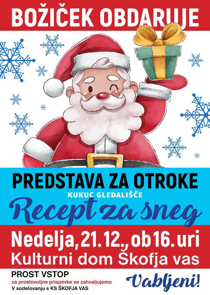 Vljudno vabljeni na otroško predstavo Recept za sneg v izvedbi Kukuc gledališča, ki bo v nedeljo, 21.12.2025, ob 16:00 v dvorani Kulturnega umetniškega društva bratov Dobrotinšek Škofja vas.