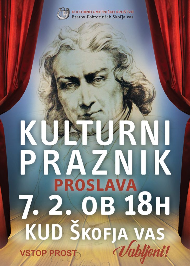 Prisrčno vas vabimo, da se nam na predvečer slovenskega kulturnega praznika pridružite na proslavi, ki bo v soboto, 7. februarja 2025 ob 18.00 uri v dvorani Kulturnega doma Škofja vas.